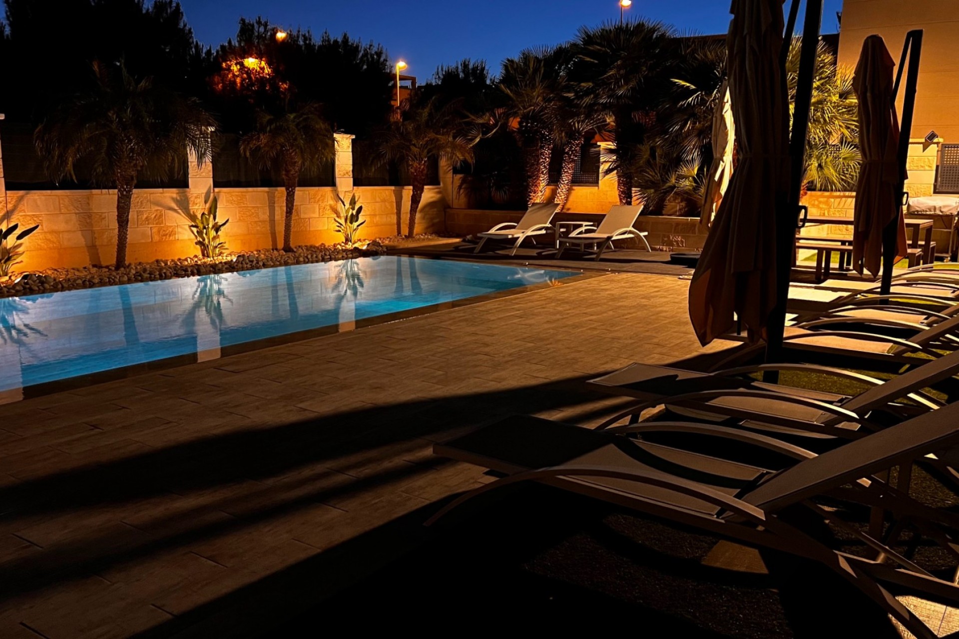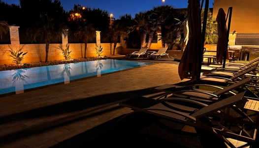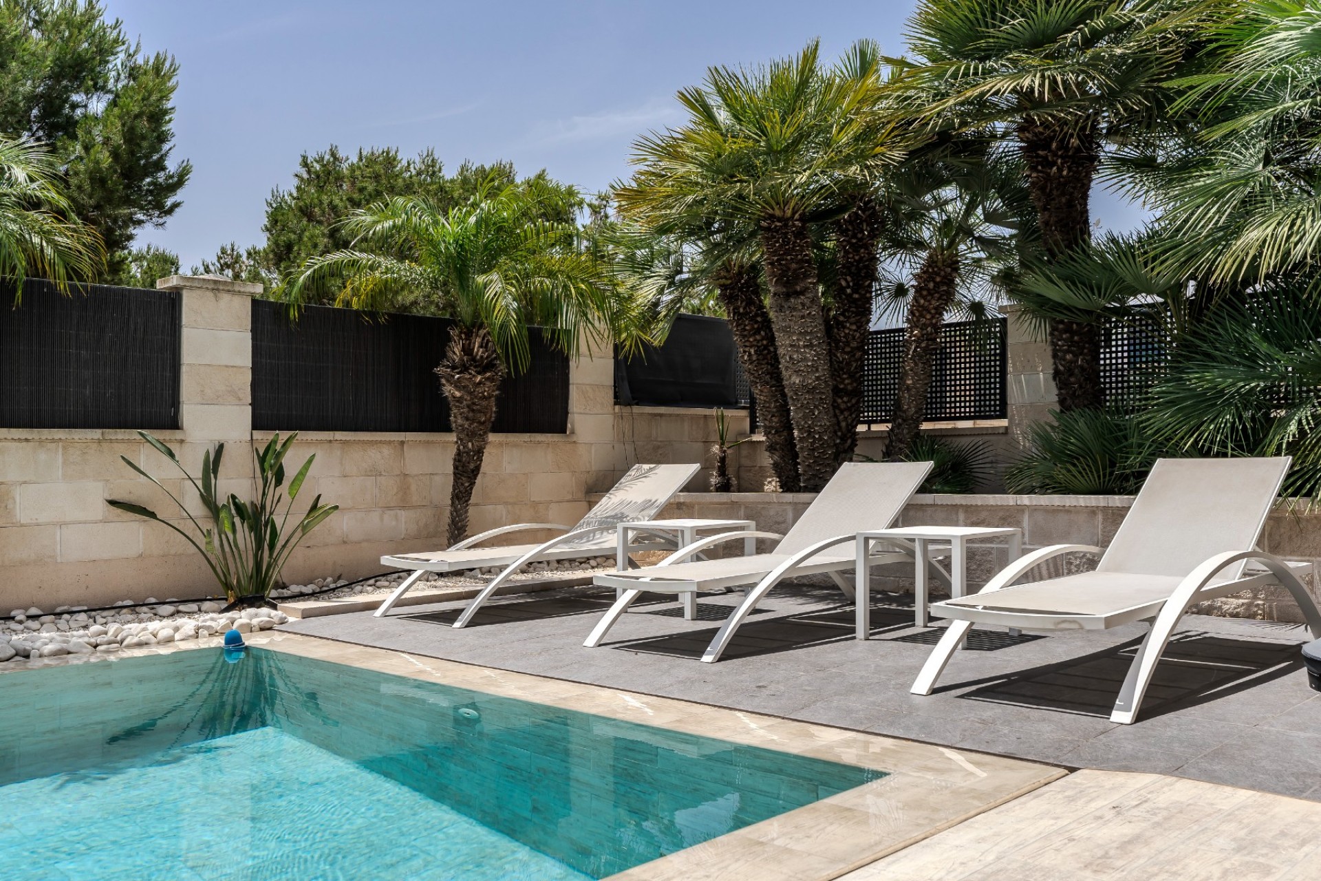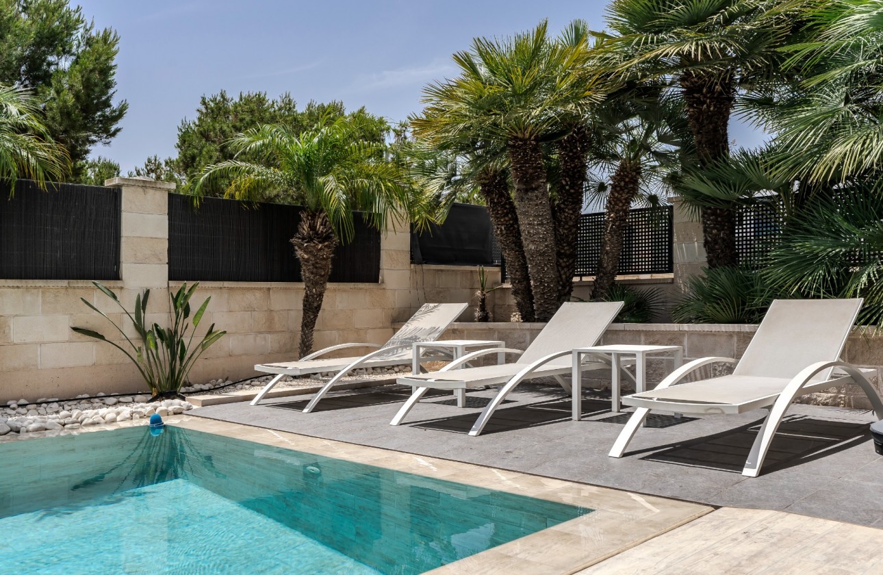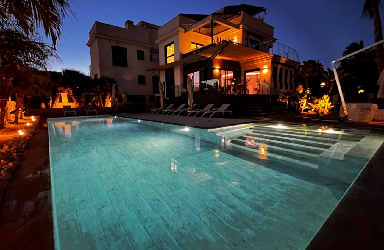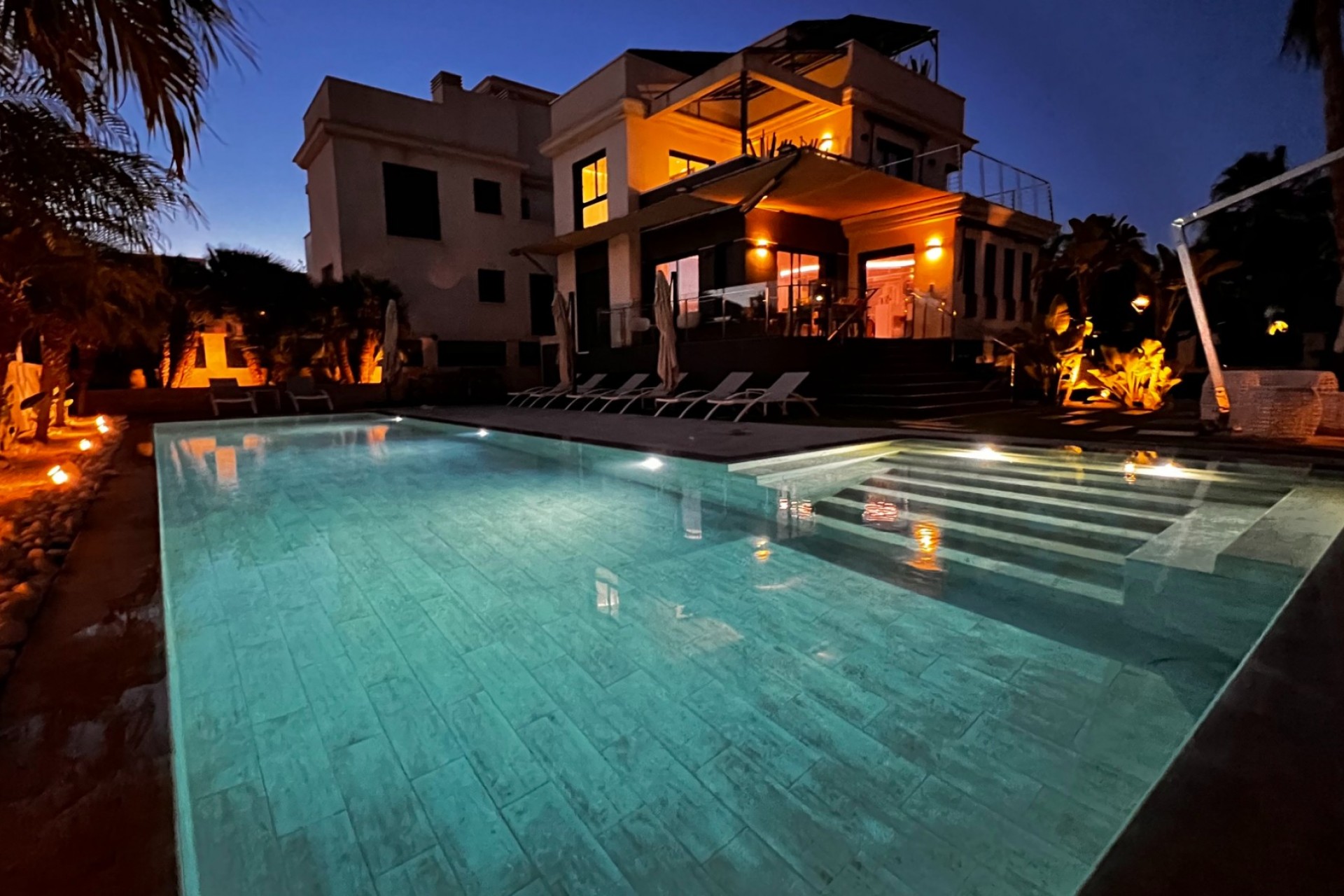 Piscina de agua salada con calefacción y azulejos antideslizantes, perfectamente adecuada para disfrutar durante todo el año.