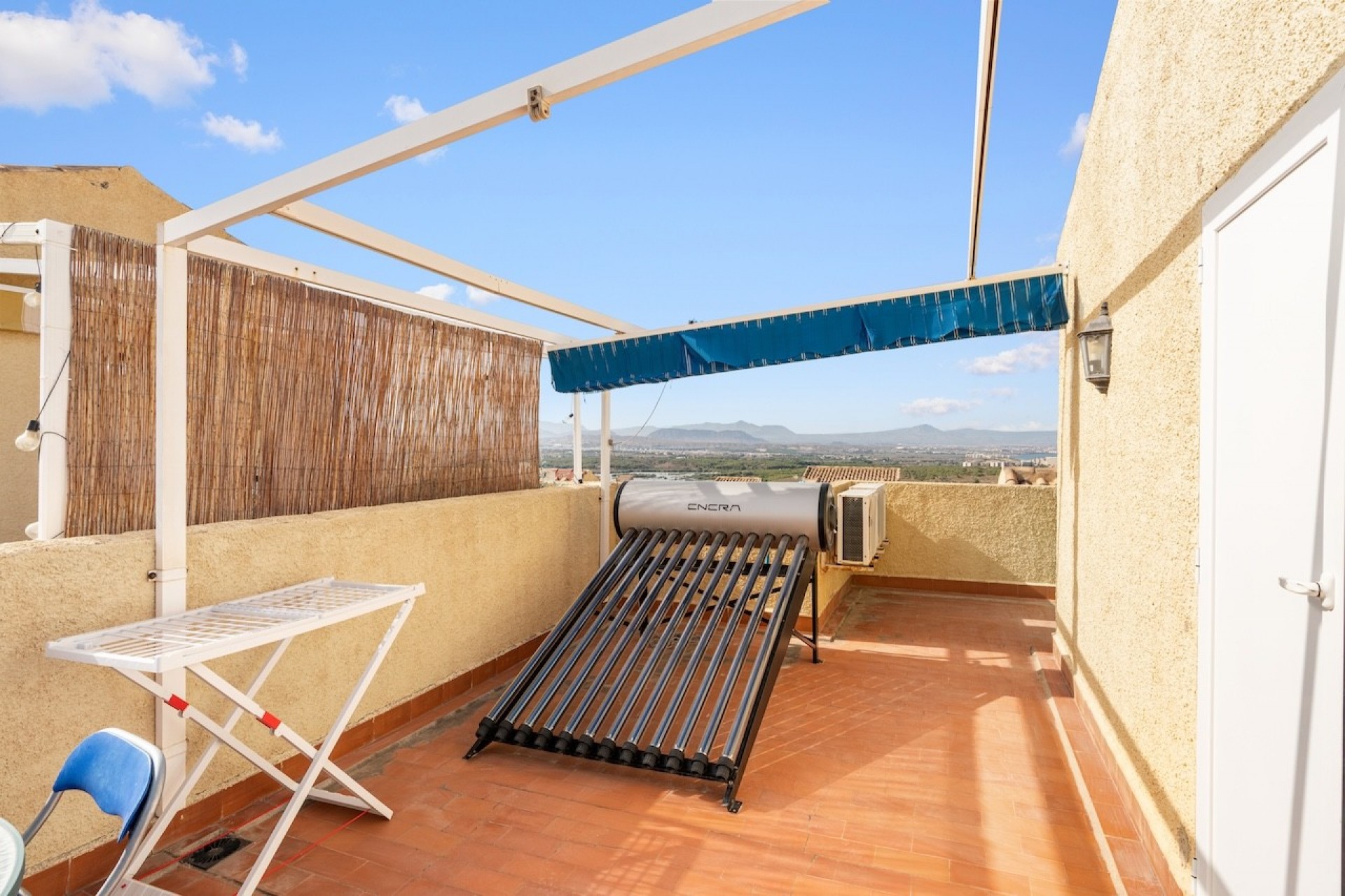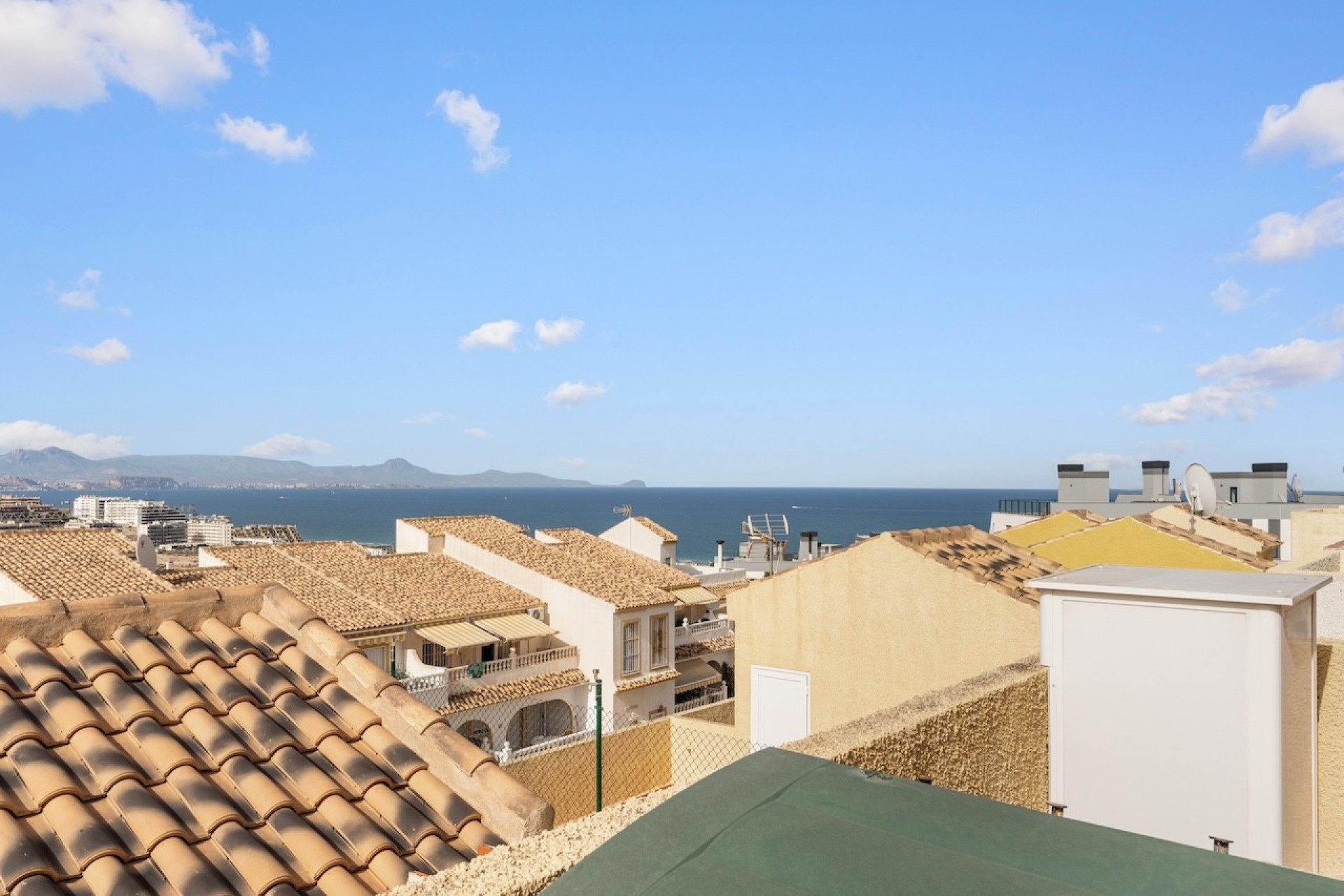 Segunda planta: solárium privado de 27 m² con vistas parciales al mar, a la piscina comunitaria y a Alicante.