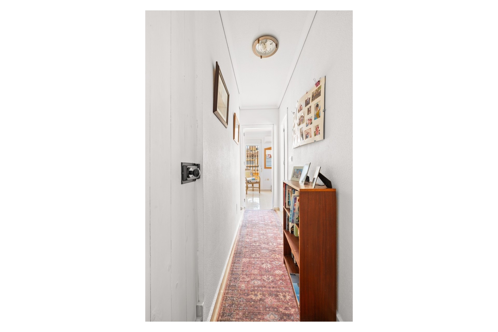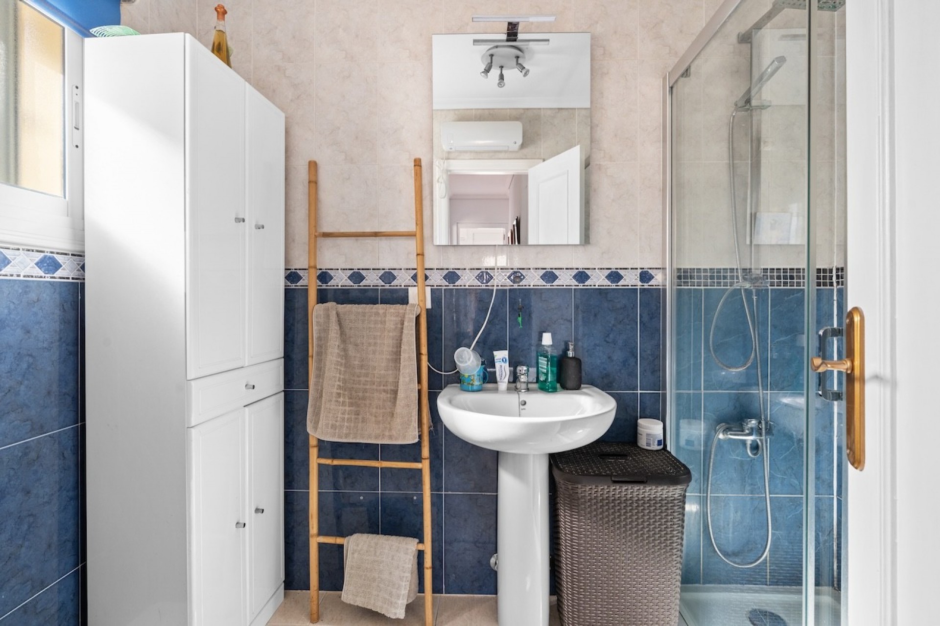 Primera planta: dos dormitorios con amplios armarios, uno con salida a una pequeña terraza. Al final del pasillo, baño funcional con amplia ducha tipo walk-in y ventana.