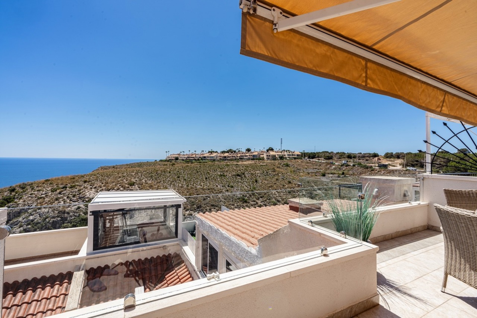 Le salon donne accès à une grande terrasse avec une magnifique vue sur la mer et la plage de Carabassi. Parfait pour les repas en plein air, les barbecues ou simplement se détendre. La terrasse dispose de stores et d’un auvent électrique pour l’ombre lors des journées ensoleillées. Les levers de soleil depuis cet endroit sont vraiment mémorables.