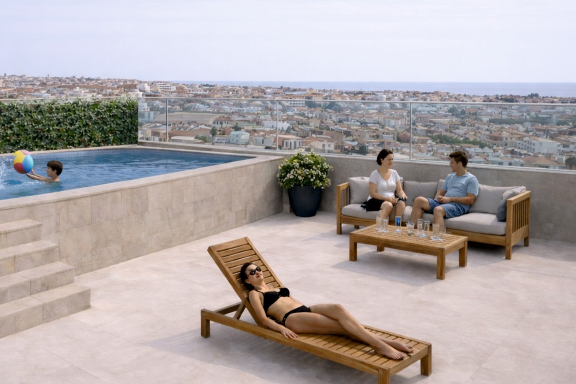Blant de mest eksklusive boligene finner vi to duplex toppleiligheter med private terrasser, solarium og privat basseng, som gir et høyere nivå av komfort, privatliv og livskvalitet. Badene leveres fullt utstyrt med baderomsmøbler, dusjvegger og gulvvarme for ekstra komfort. I tillegg inkluderer boligene forsterket sikkerhetsdør, utvendig snekring med termisk brudd og doble vinduer, samt forhåndsinstallasjon for kanalisert klimaanlegg, noe som sikrer energieffektivitet og komfort hele året.