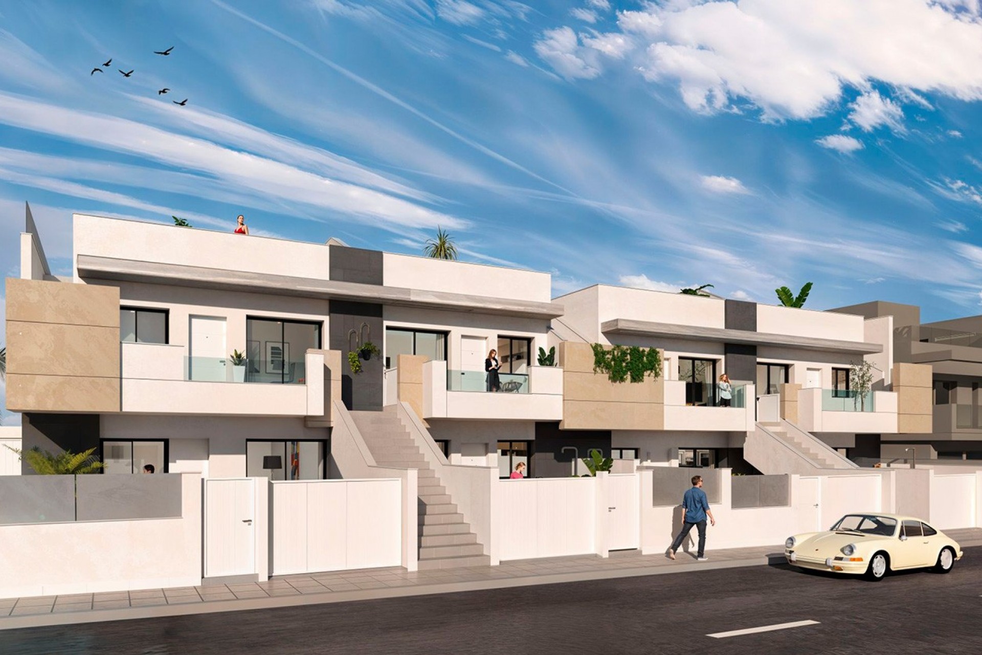 Bungalower i toppetasje, med terrasse og en romslig privat takterrasse (solarium) med utekjøkken, perfekt for å nyte middelhavslivet. Noen enheter inkluderer også jacuzzi. Disse boligene har også privat parkering og bod i første etasje.