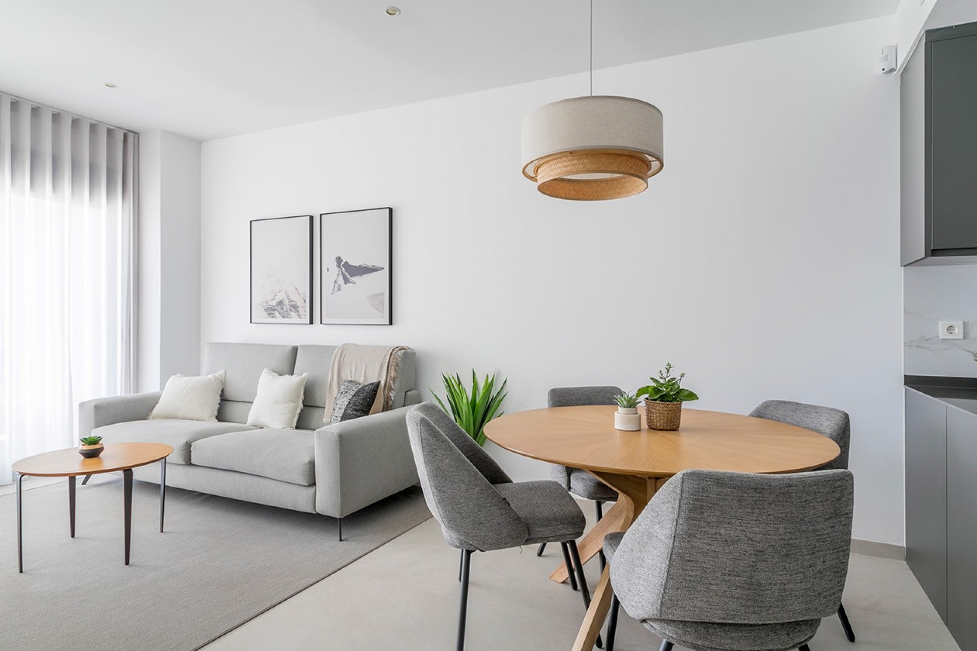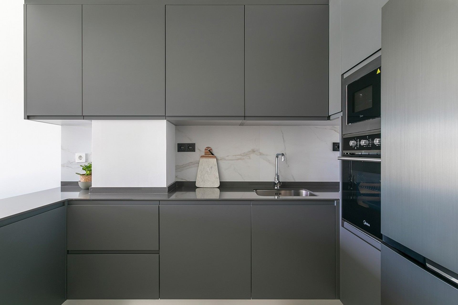 • Kitchens: Fully furnished with upper and lower cabinets. Equipped with a ceramic hob, oven, extractor hood, and pre-installation for a dishwasher.