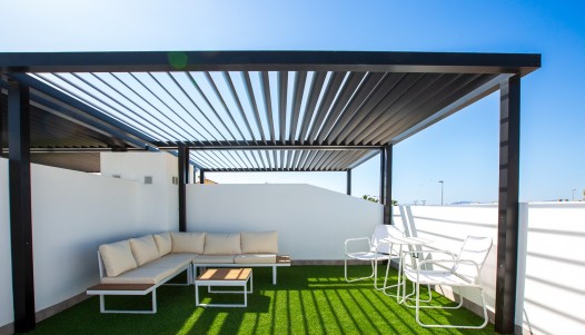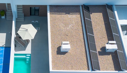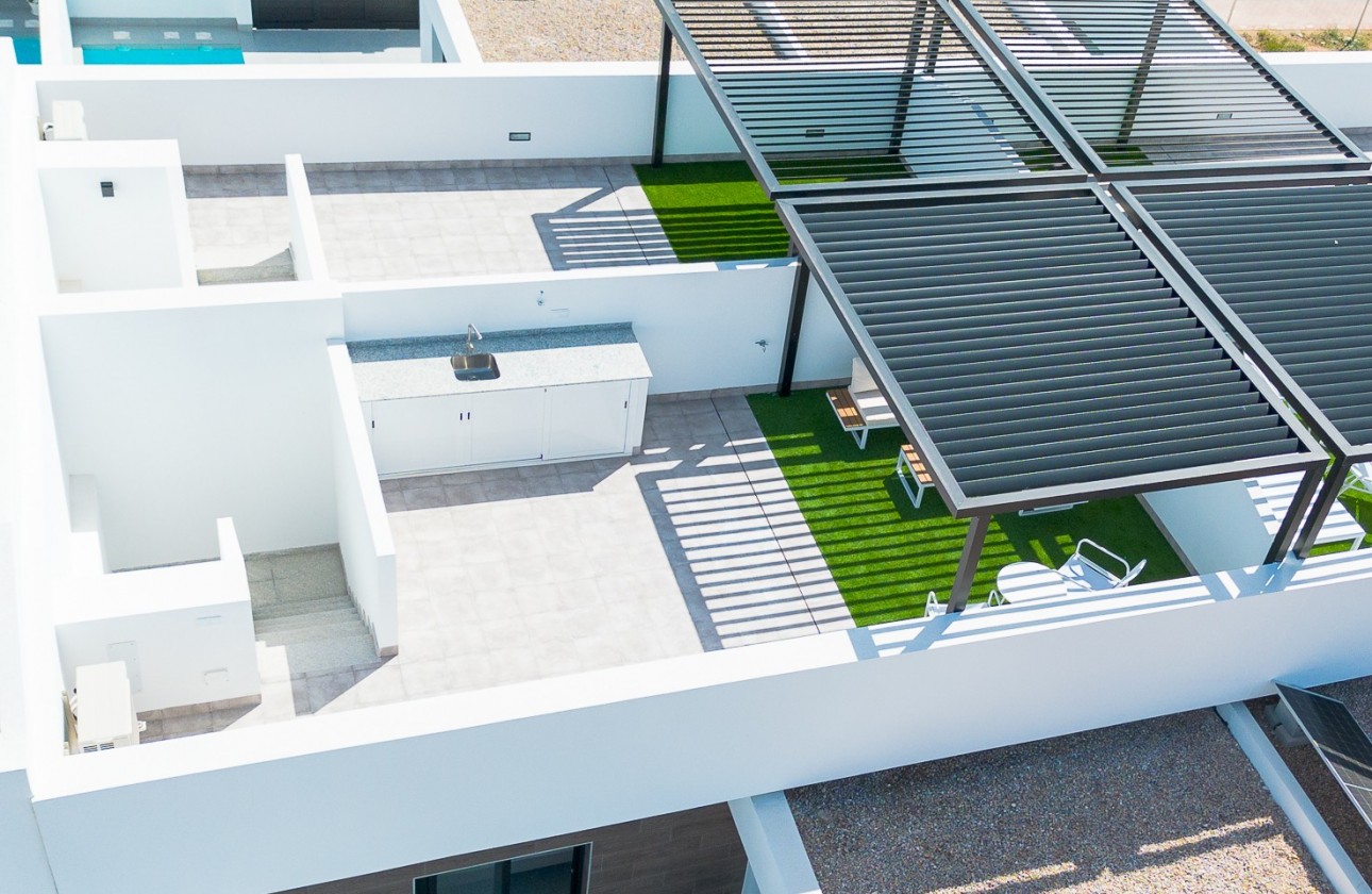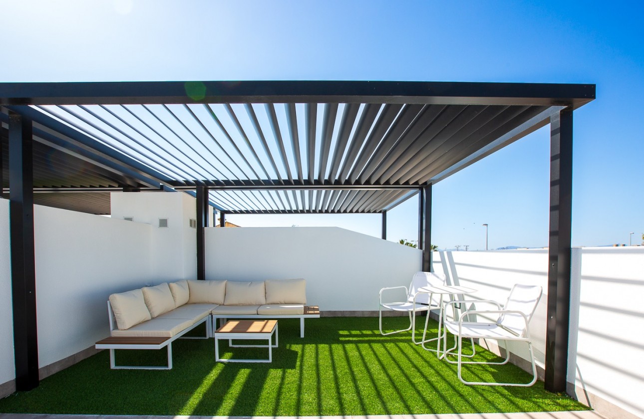 Step outside into your private garden, where a sparkling pool awaits—perfect for refreshing dips on hot summer days. Upstairs, the highlight of the home is the expansive 39 m² rooftop solarium, complete with a pergola and a fully equipped outdoor kitchen, offering a spectacular setting for dining, relaxing, or enjoying the region’s 300+ days of sunshine per year.