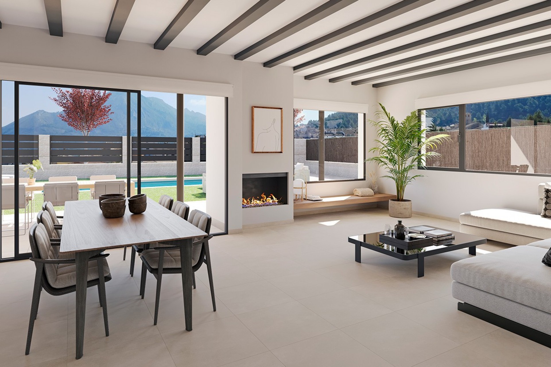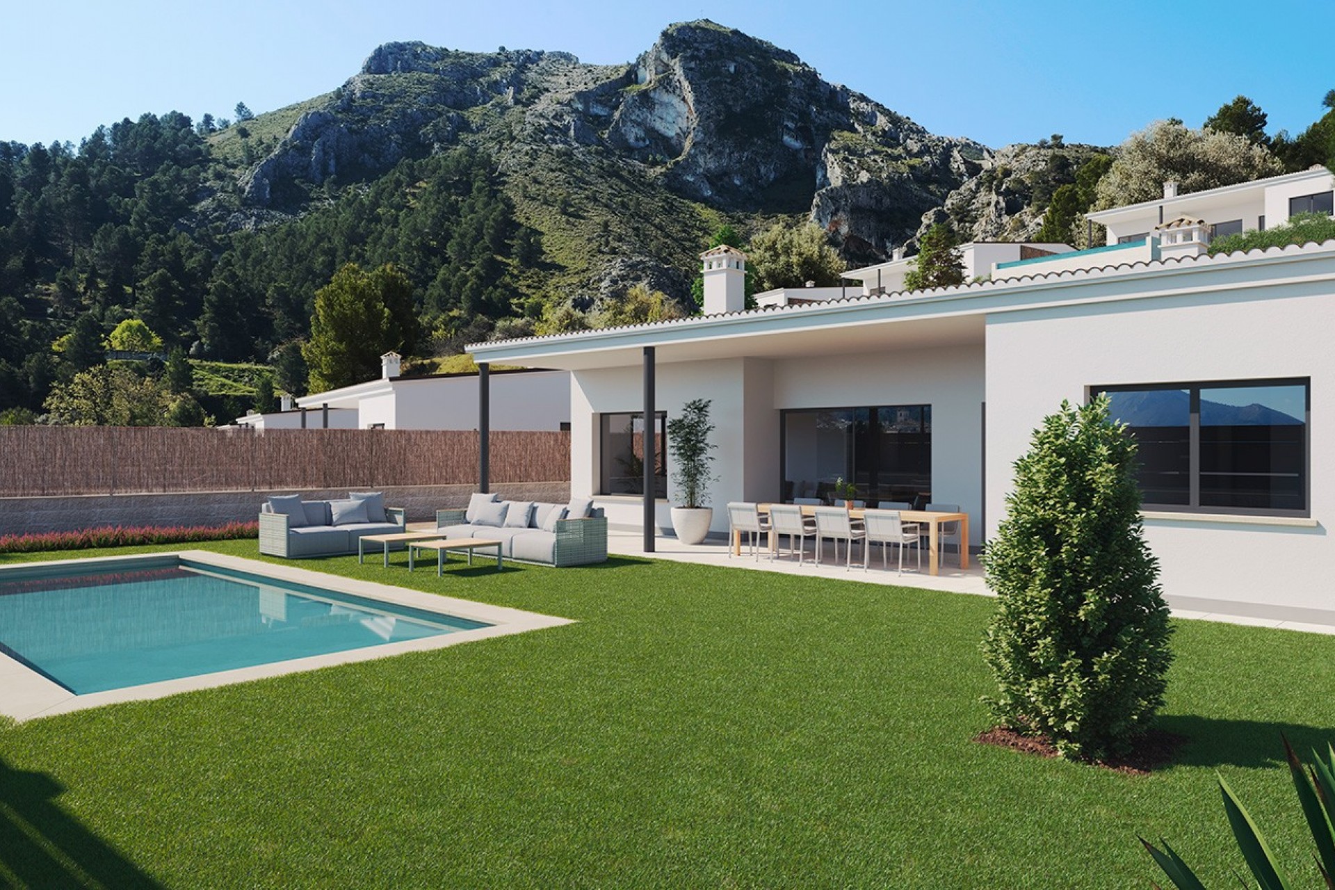 Costa Blanca Eiendom presents an exclusive development of 35 newly built detached villas, set in the heart of nature in the Sierra de Aitana, next to the charming village of Penáguila. These villas offer the perfect opportunity to enjoy a peaceful and healthy lifestyle, surrounded by mountain landscapes and only 55 minutes from the coast of Benidorm.