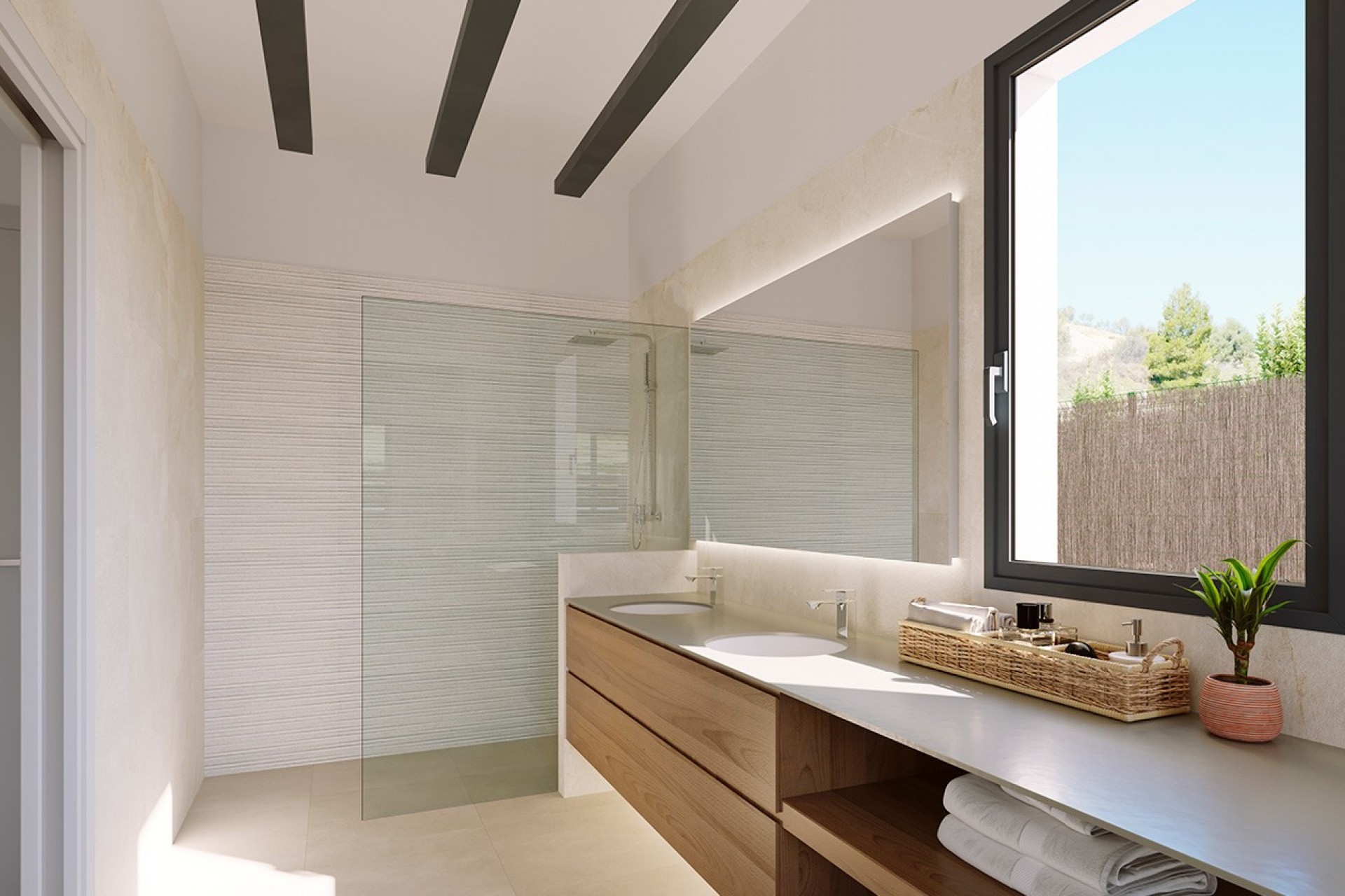 These villas stand out for their high-quality finishes and commitment to sustainability. They feature underfloor heating throughout, powered by an aerothermal system with independent thermostats; PVC exterior carpentry with double glazing and electric shutters; LED interior lighting, including LED strips inside fitted wardrobes; and fully equipped kitchens with appliances. In addition, they offer covered parking with a metal pergola and photovoltaic solar panels, helping to reduce energy consumption and increase comfort.