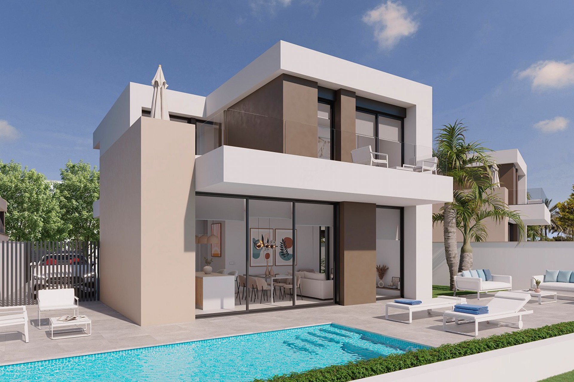 Each villa features 3 spacious bedrooms and 3 bathrooms, distributed over two floors on private plots of 300 m². All include a finished garden with artificial grass, a private pool, on-plot parking and pre-installation for an electric car charger. Their contemporary design, combined with carefully selected high-quality materials, ensures a modern, efficient environment ready to enjoy from day one.