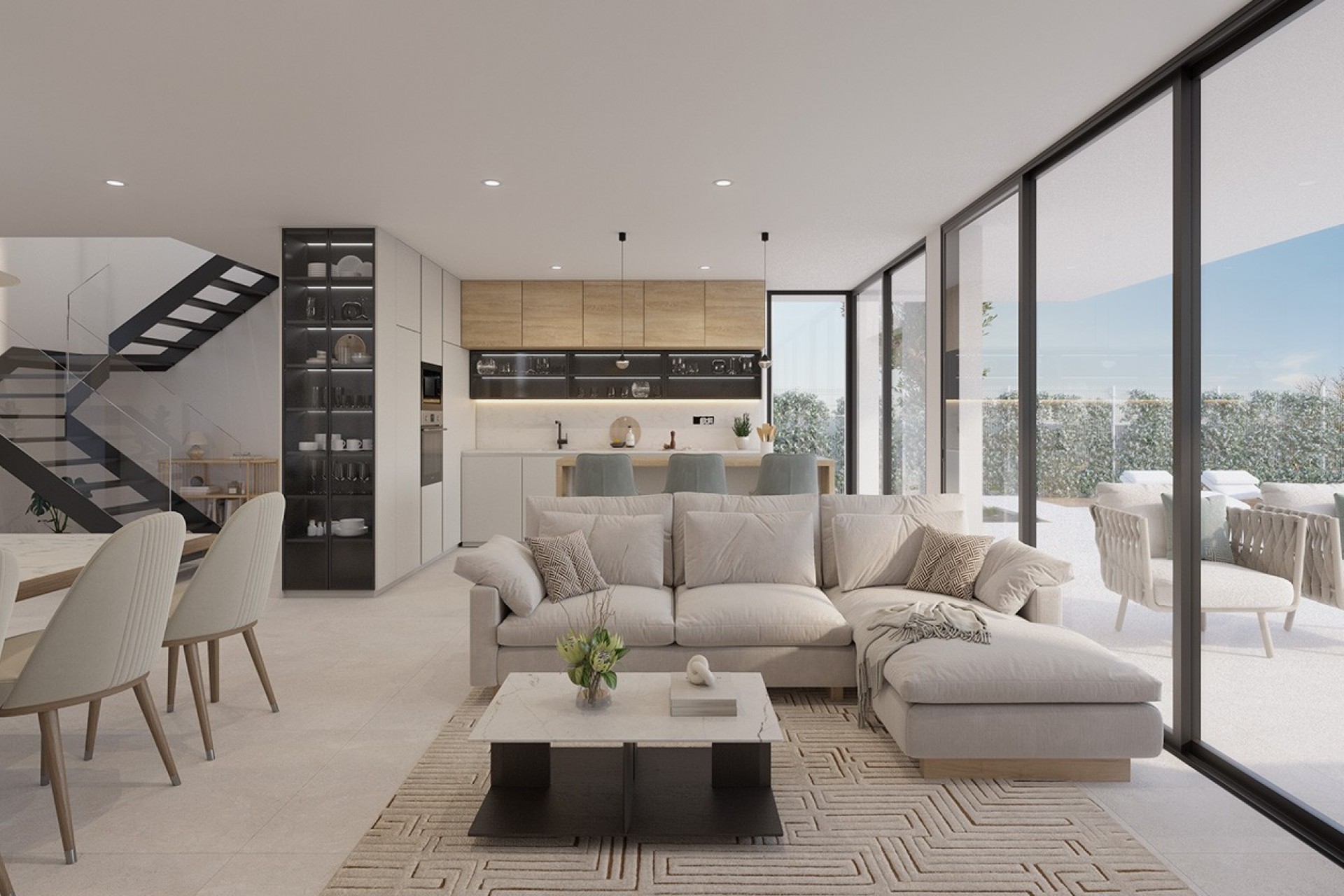 The properties are distributed over two floors, allowing for a clear separation between the day and night areas. The ground floor features the main living area alongside the master bedroom, providing comfort and independence, while the secondary bedrooms are located on the upper floor. The interior staircase stands out as a central design element, crafted with attention to both aesthetics and construction quality.