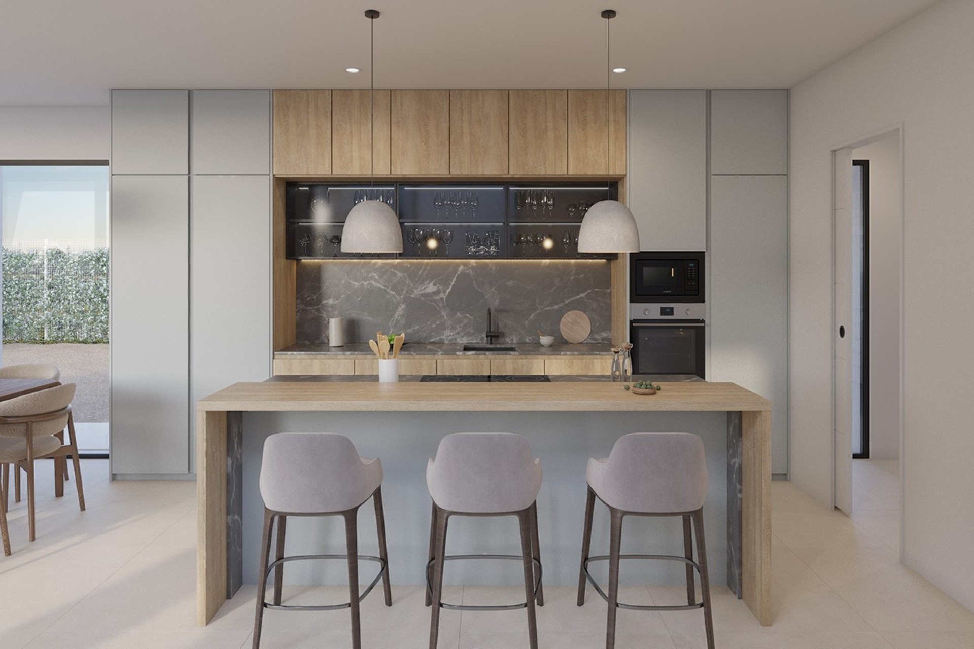 The home is characterized by rooms that open onto the garden and pool, creating a seamless natural transition between the interior and exterior. An elegant patio open to the living room becomes a centerpiece space, ideal for enjoying the surroundings and natural light at any time of day, adding character and personality to the home and welcoming a new concept of Mediterranean living.