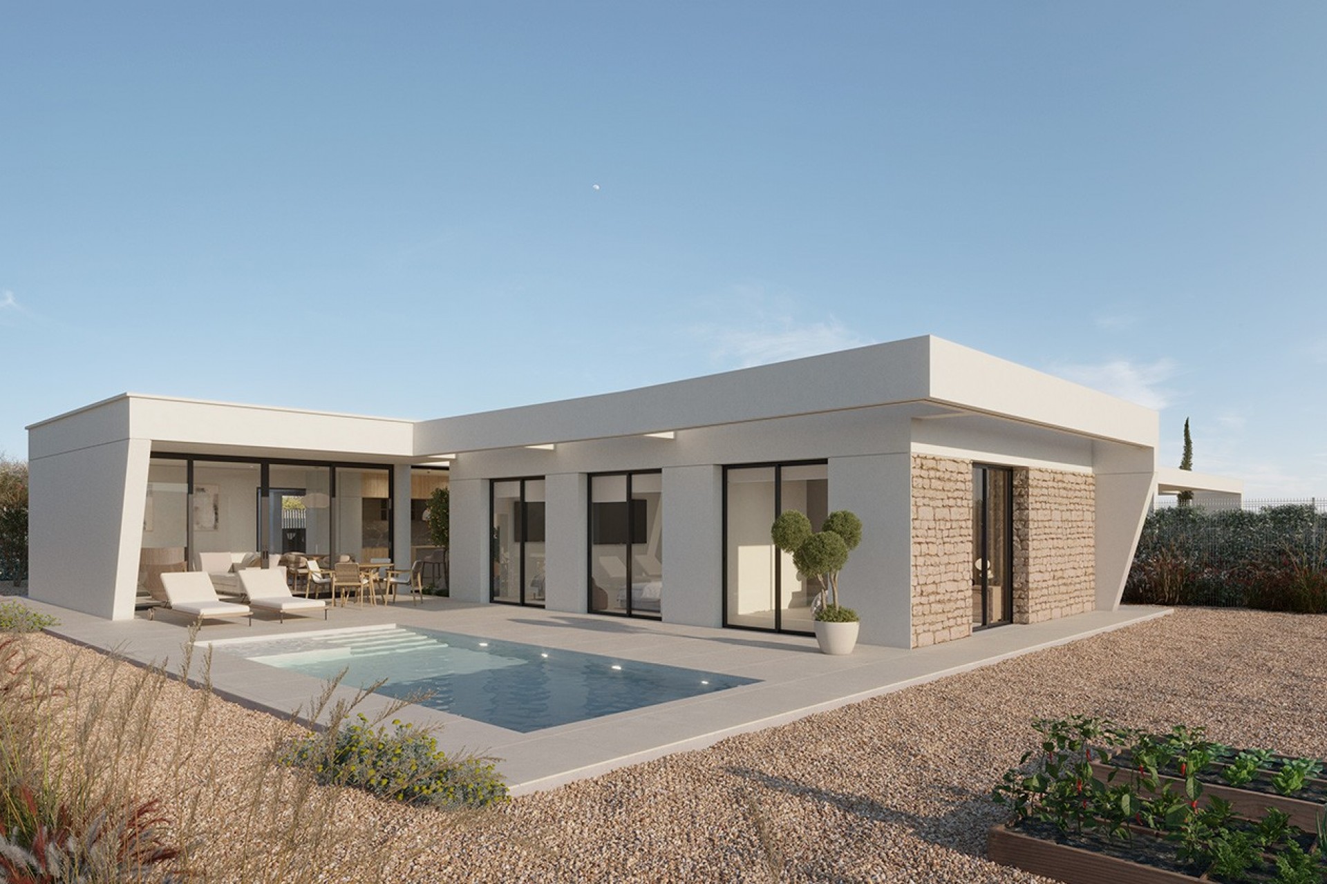Costa Blanca Eiendom presents a sophisticated contemporary single-story villa, designed to enjoy a Mediterranean lifestyle in perfect harmony with nature, golf, and outdoor living. Its careful architecture prioritizes luminosity, the flow of spaces, and a direct connection with the outdoors.