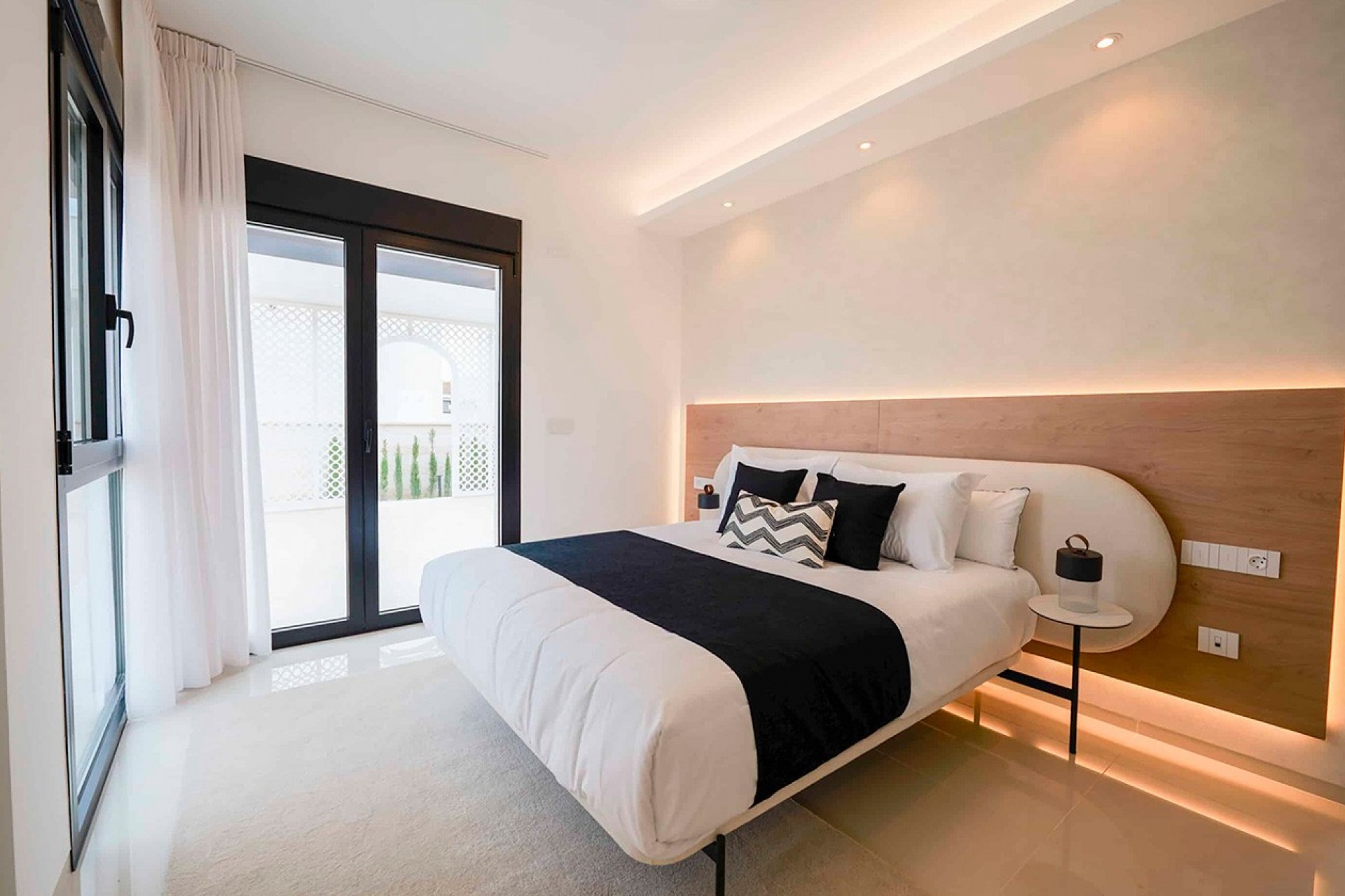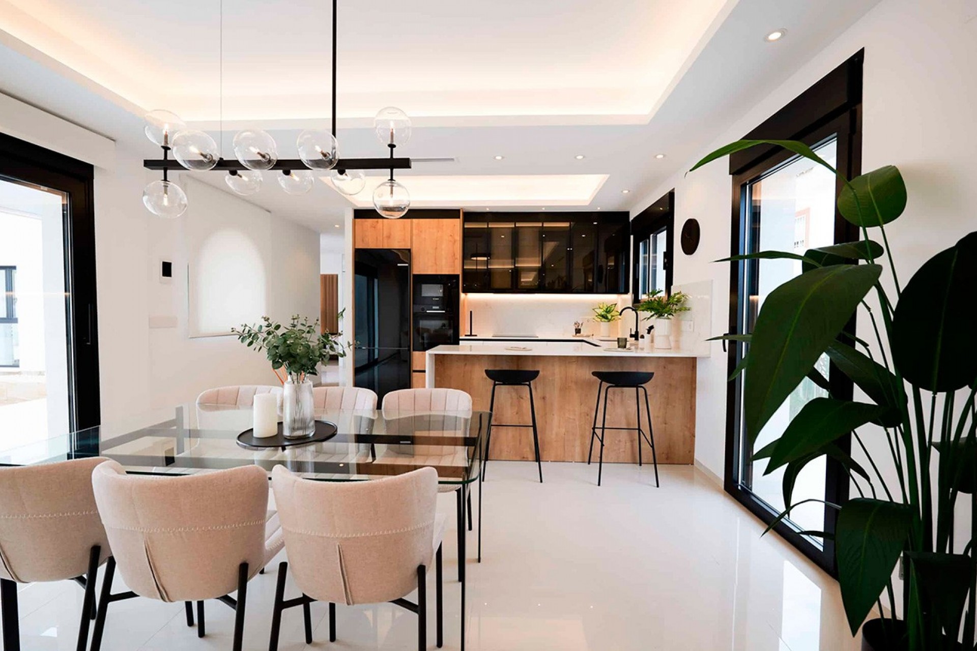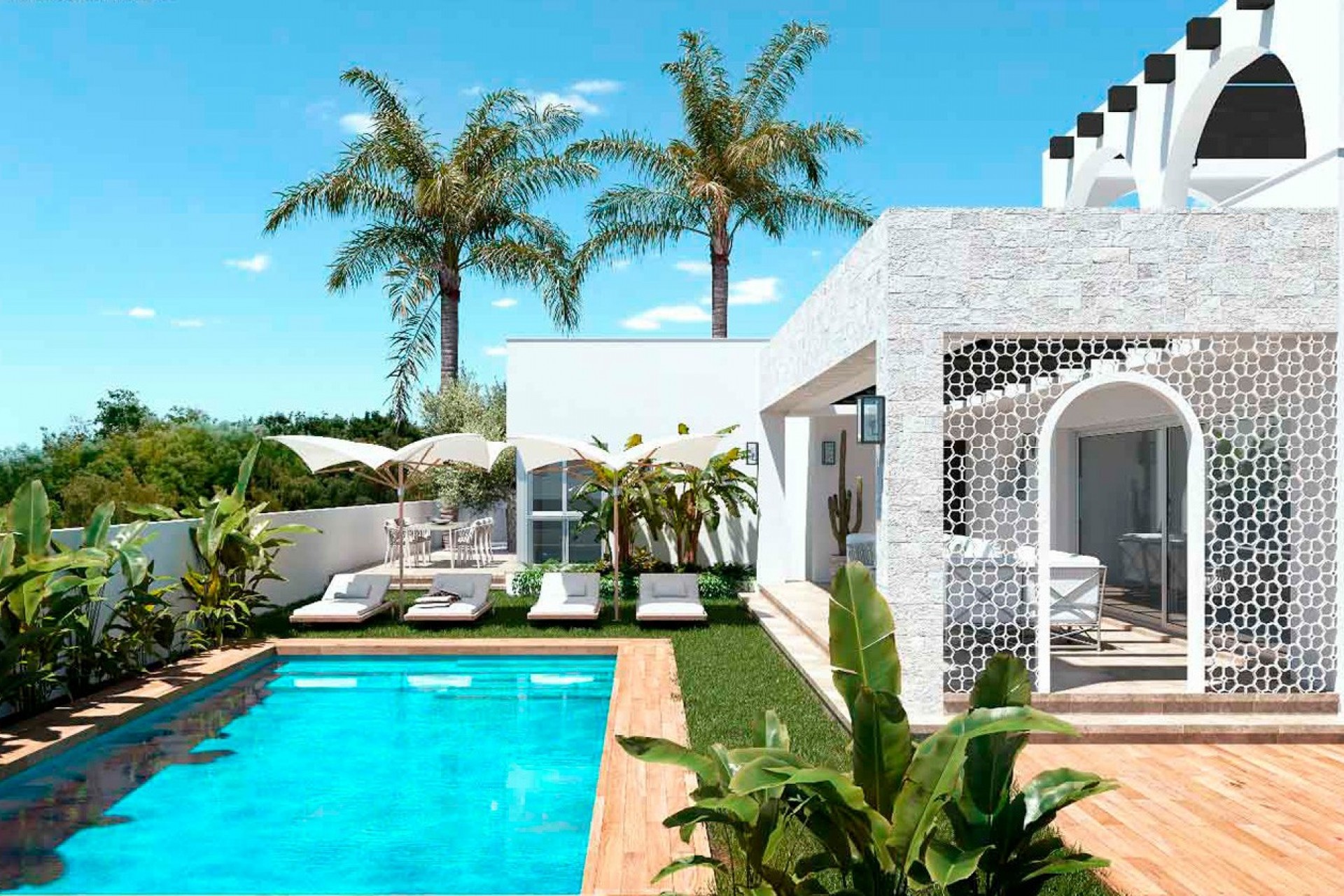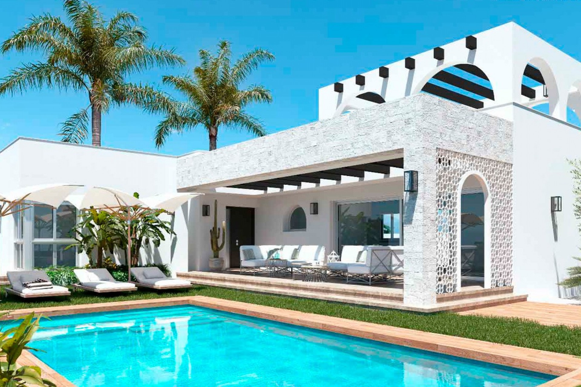 Distributed on a single floor, the villa features three spacious bedrooms and two or three bathrooms, providing bright and well-organized spaces for daily comfort. The living-dining room, with an open-concept kitchen, integrates naturally with the outdoors thanks to its large windows, creating a harmonious and welcoming atmosphere that invites you to enjoy the light and views.