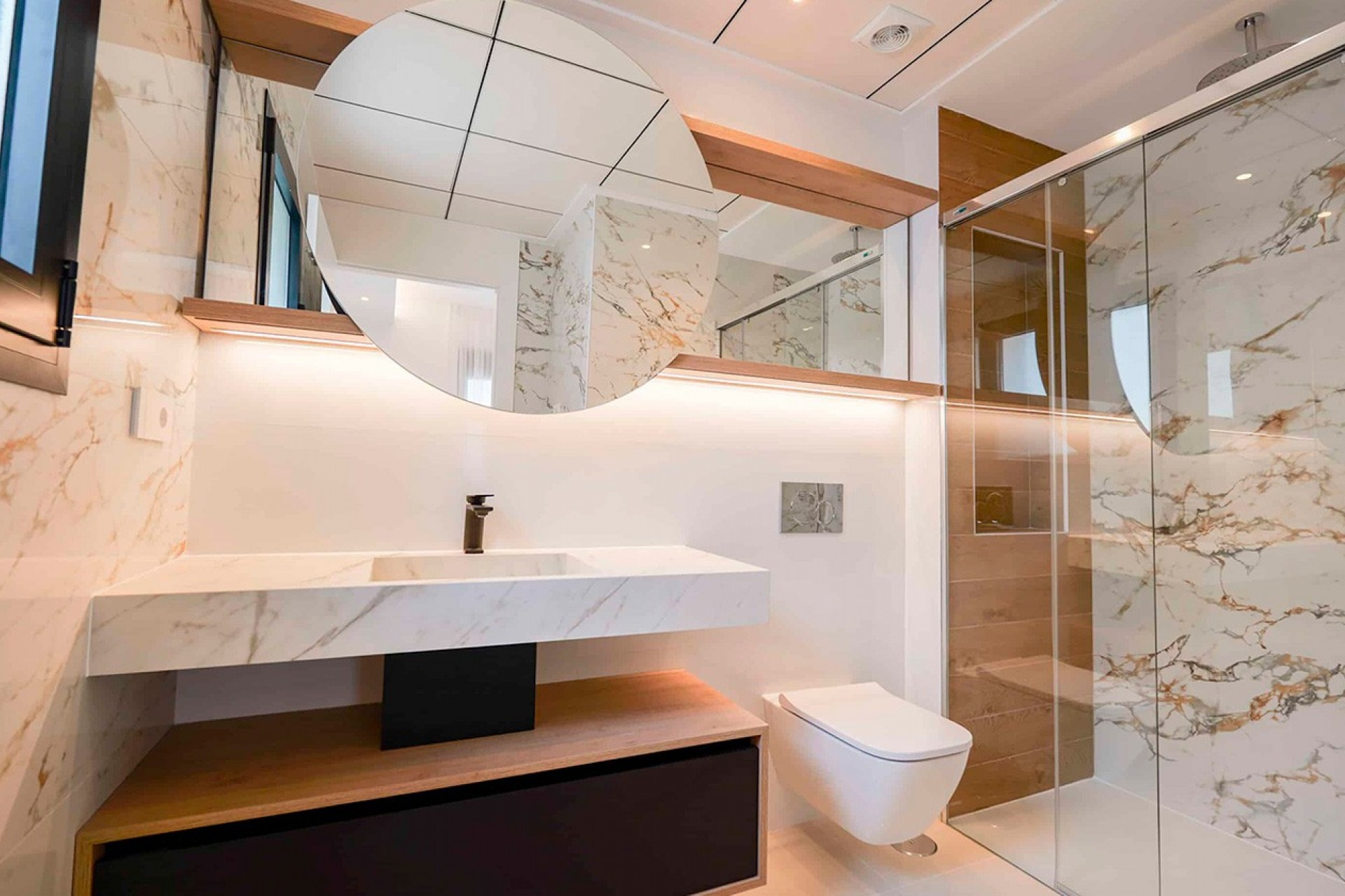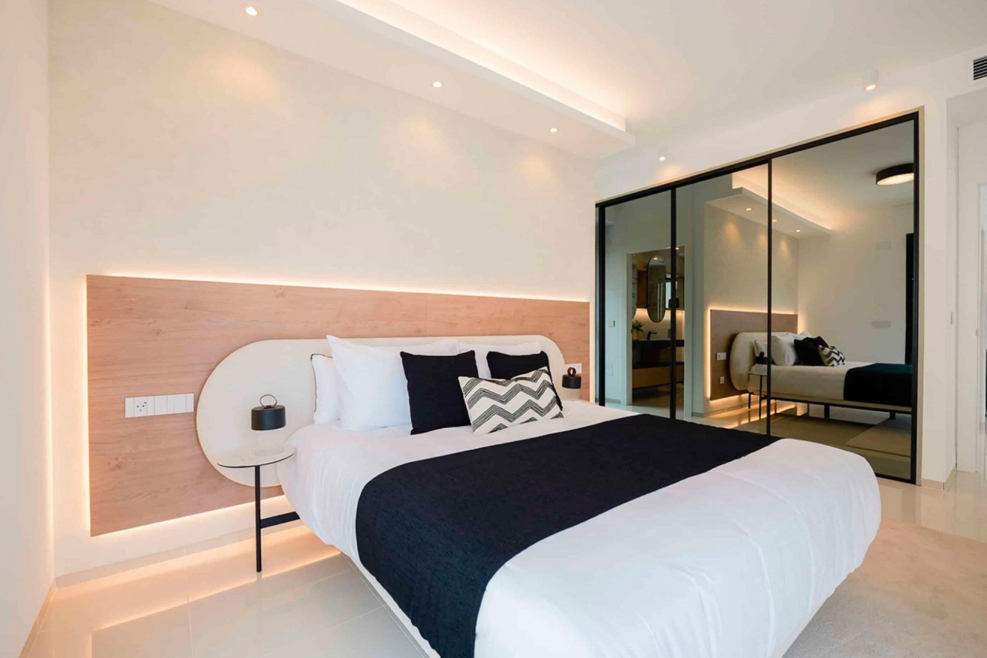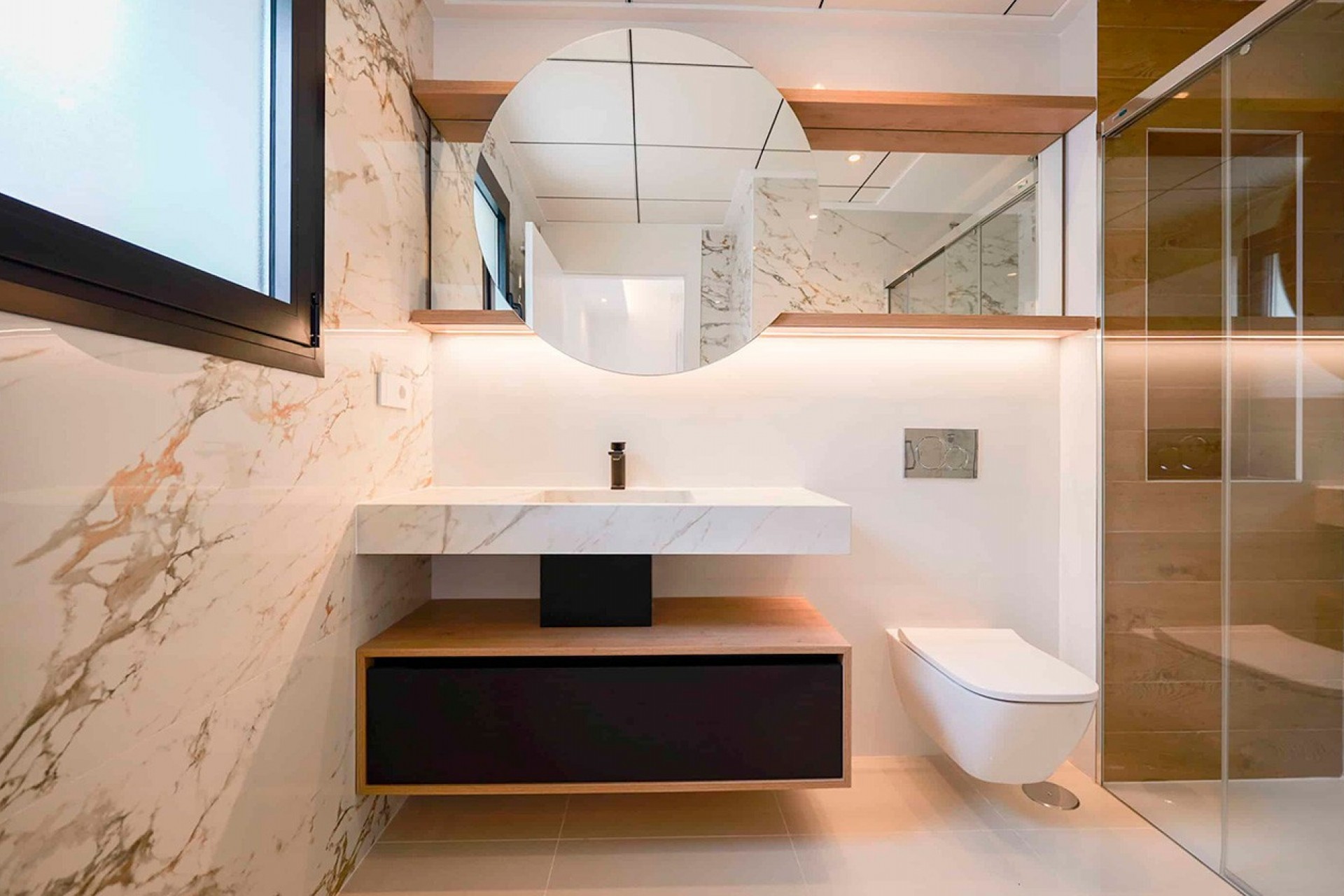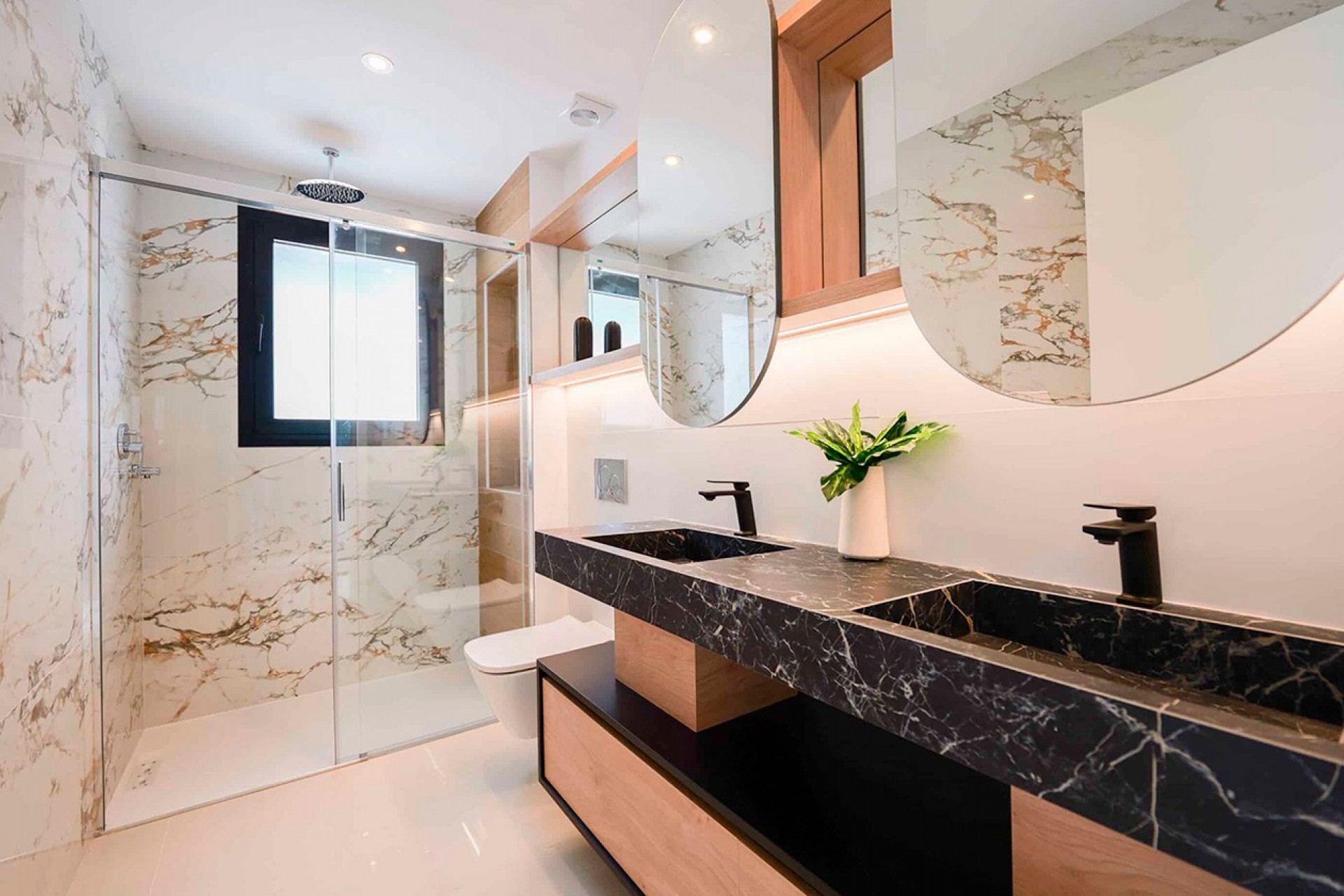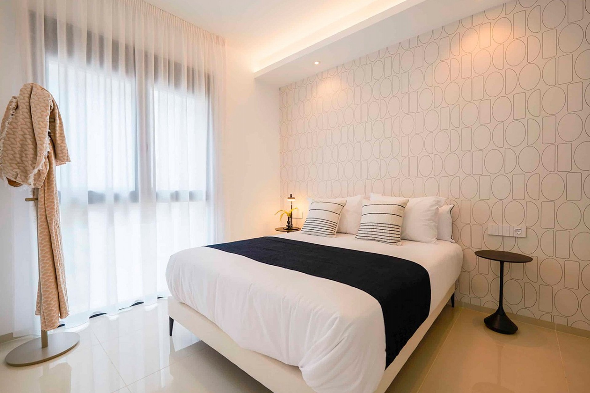 Distributed on a single floor, the villa features three spacious bedrooms and two or three bathrooms, providing bright and well-organized spaces for daily comfort. The living-dining room, with an open-concept kitchen, integrates naturally with the outdoors thanks to its large windows, creating a harmonious and welcoming atmosphere that invites you to enjoy the light and views.