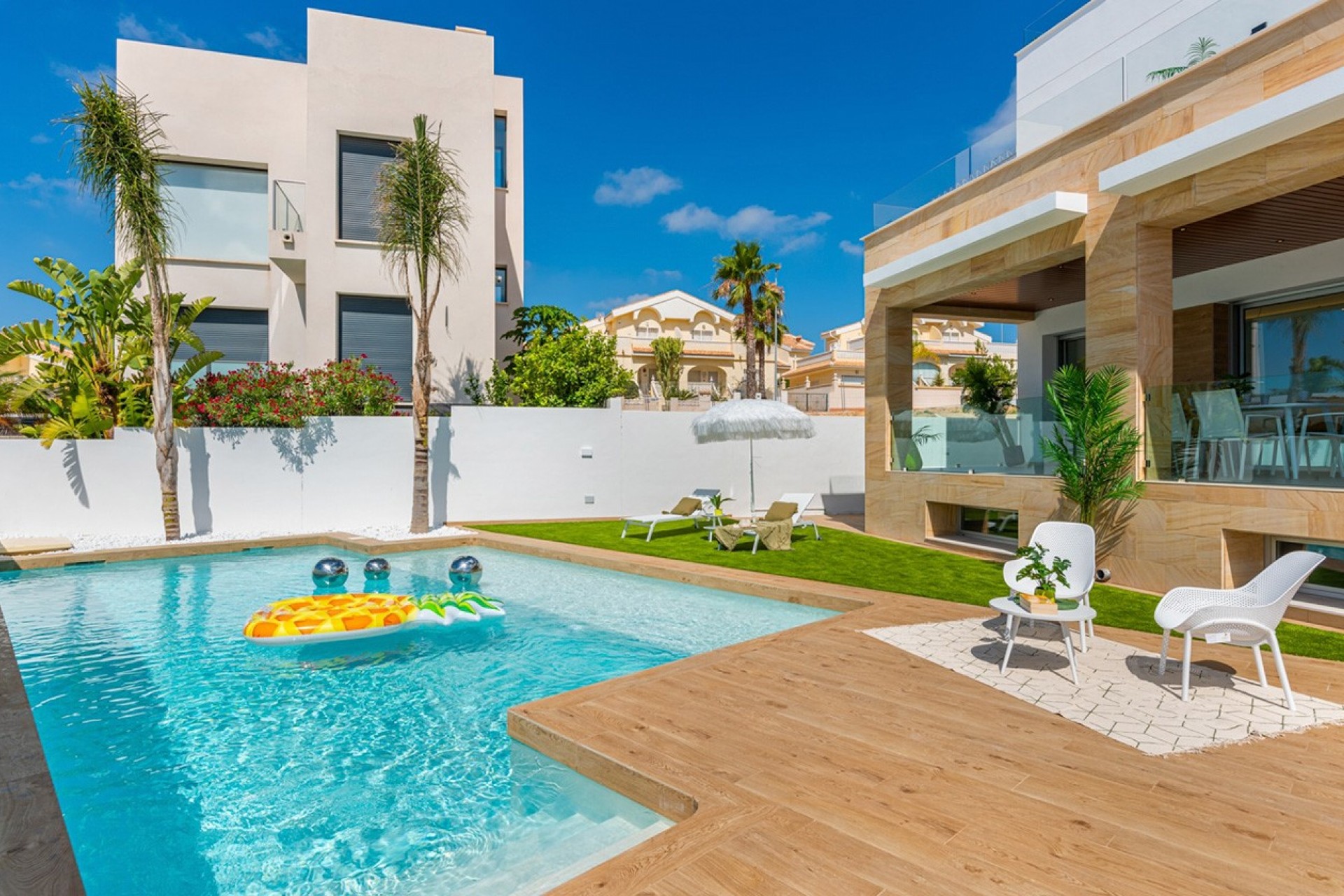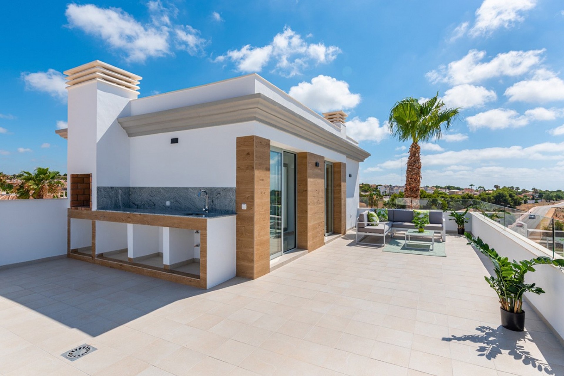 Costa Blanca Eiendom presents this impressive independent villa, part of an exclusive residential complex of seven homes, designed to offer maximum comfort, privacy, and style in Ciudad Quesada. Each villa features private outdoor areas, including a garden with a pool and a spacious solarium prepared for the installation of an outdoor kitchen, shower, or jacuzzi, creating a perfect space to enjoy the Mediterranean climate and unforgettable moments outdoors.