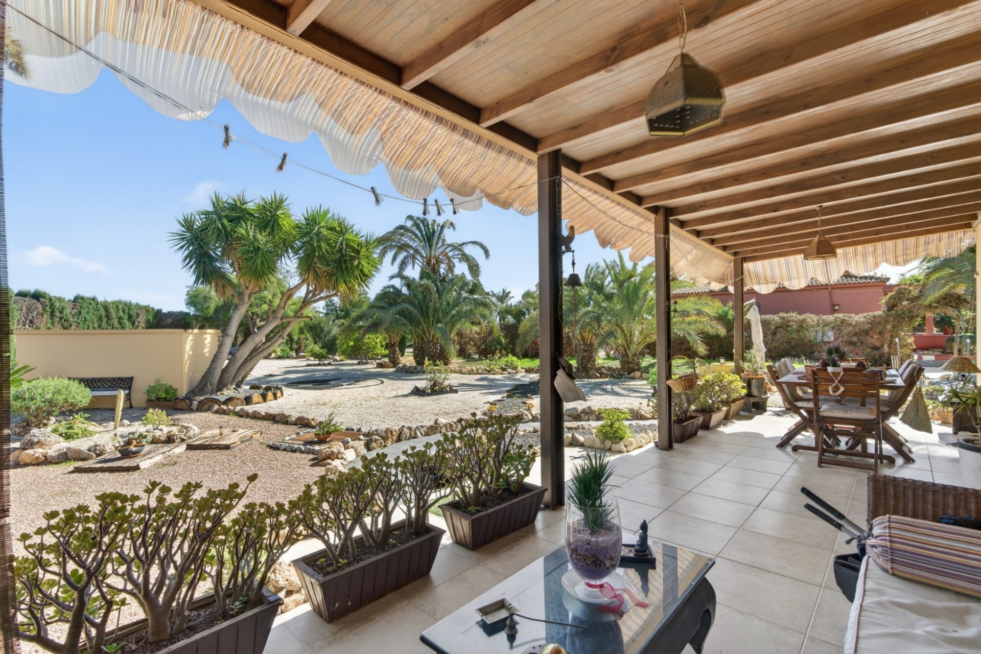 The 6,000 m² plot is beautifully landscaped with palm trees, green areas and several chill-out spaces. There is ample room to build a swimming pool if desired.
