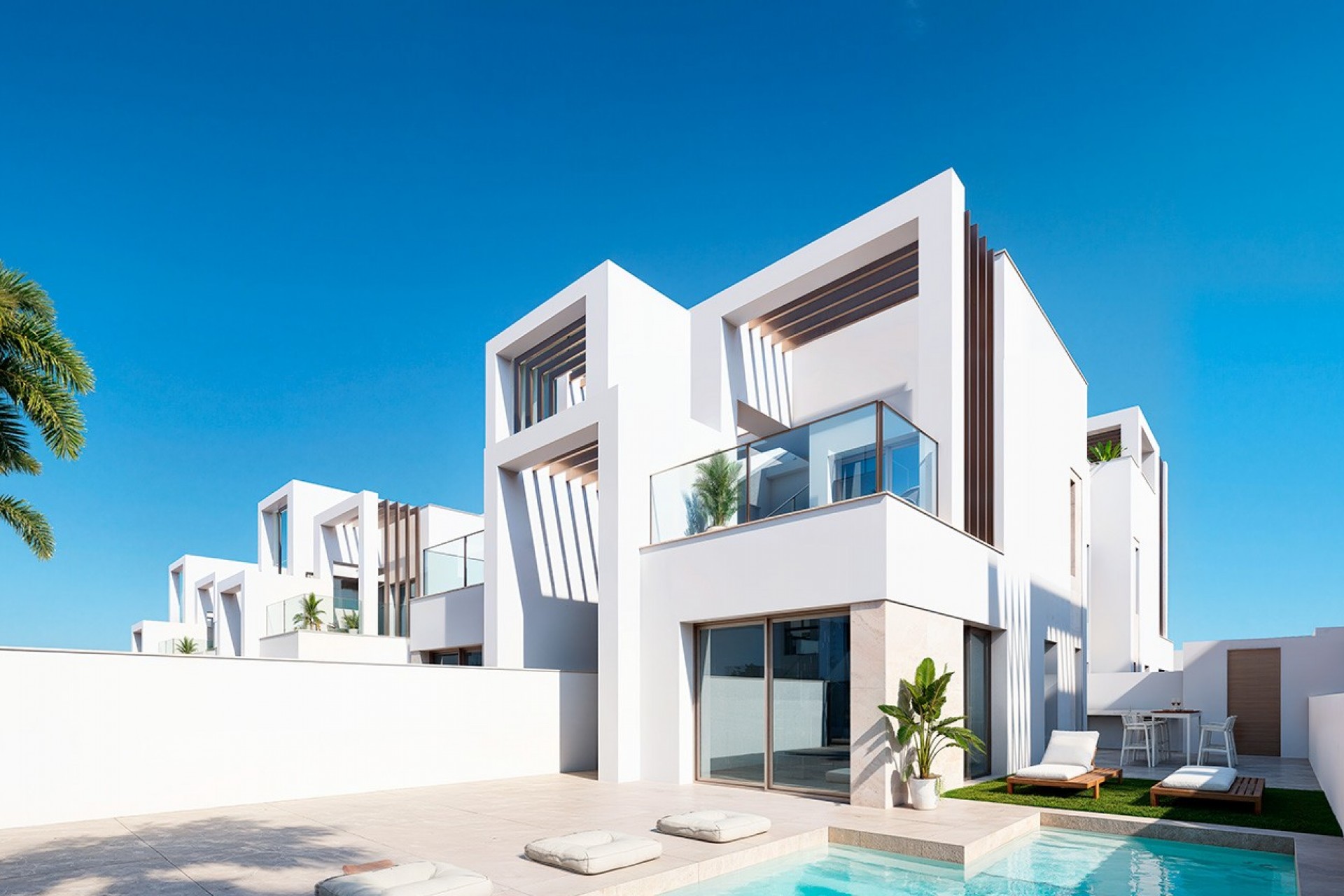 These quad-style townhouses represent an excellent opportunity for those seeking a modern property with private outdoor spaces in a strategic location close to the sea, golf, and all the services necessary for comfortable living on the Mediterranean coast.