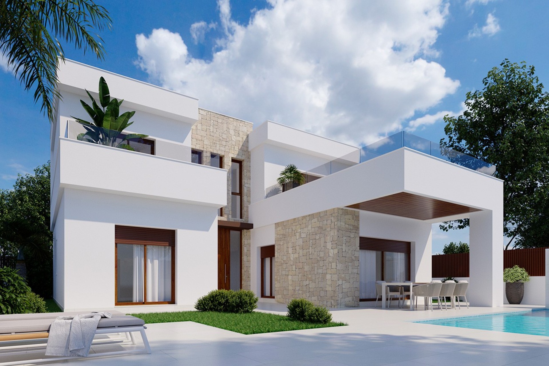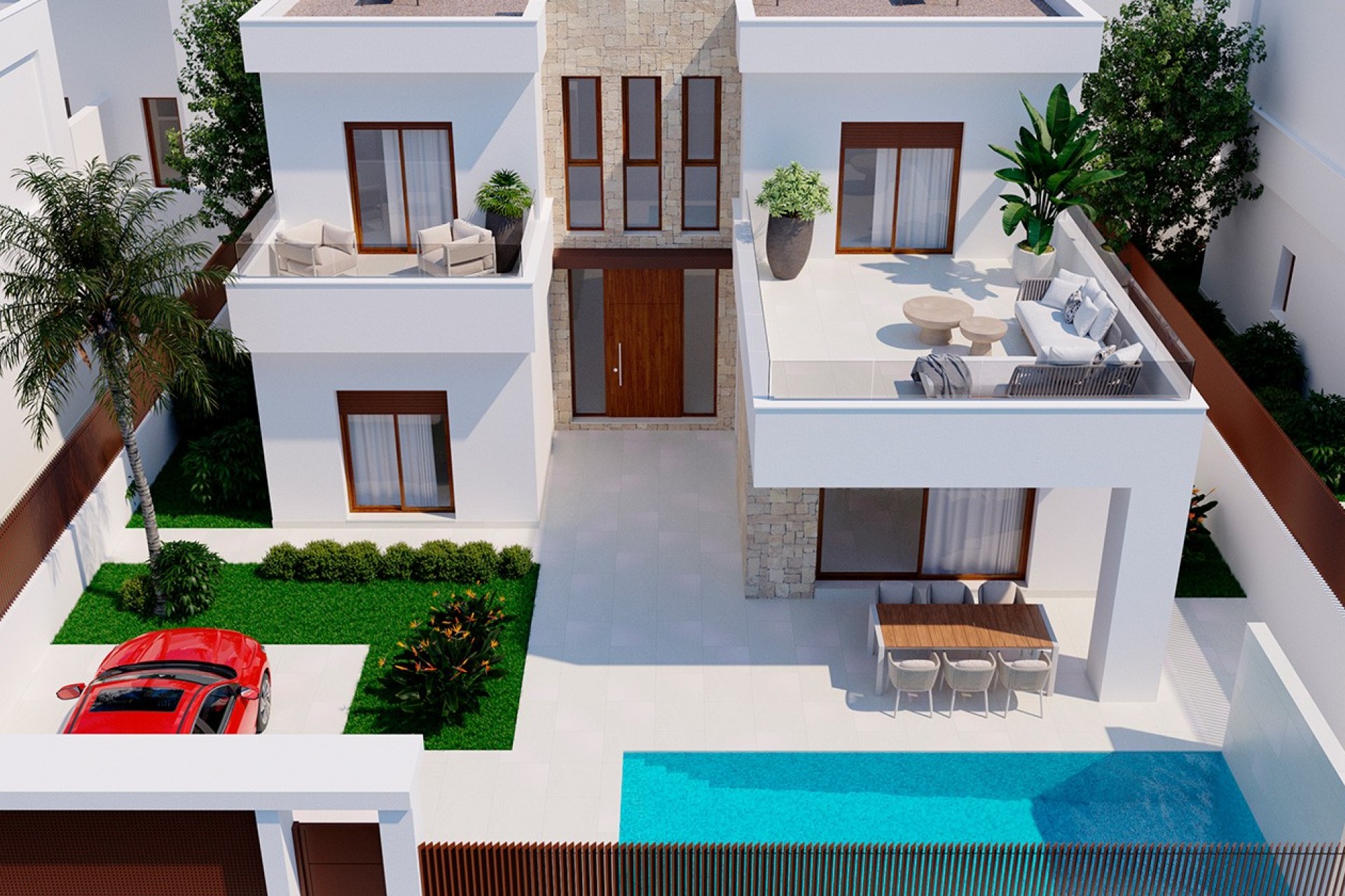 Utomhus har varje fastighet en privat pool omgiven av anlagda trädgårdar som inbjuder till avkoppling. De stora terrasserna och solariumet är perfekta för att njuta av det fantastiska medelhavsklimatet, medan privat parkering ger extra bekvämlighet och säkerhet för de boende.