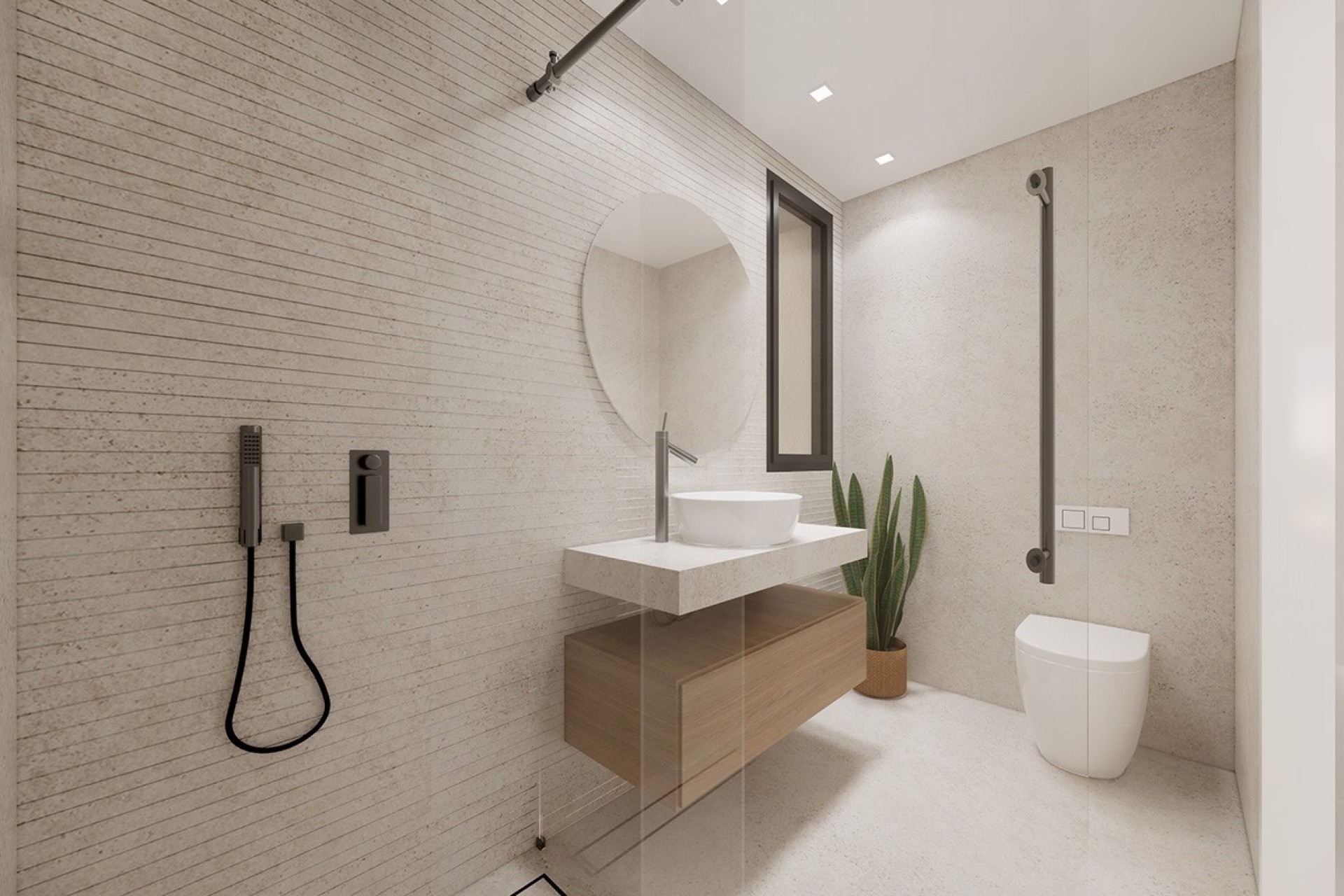 Invändigt utmärker sig bostäderna genom sin funktionalitet och sina förstklassiga materialval. Villan har tre sovrum och två badrum, smart fördelade för att passa en modern livsstil. Golv av porslinsstengods, elektriska persienner och inkluderade vitvaror bidrar till komfort, hållbarhet och en samtida stil. Inbyggda garderober erbjuder praktisk förvaring och skapar en ordnad och harmonisk miljö i alla rum.