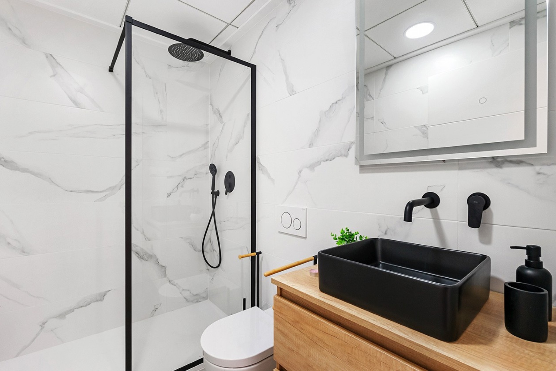Lägenheterna har en modern och funktionell design och finns i flera alternativ: bottenvåningar med privata trädgårdar, mellanvåningar med stora terrasser och takvåningar med privat solarium. Alla bostäder har 3 sovrum och 2 badrum, där master bedroom har eget badrum. De är utformade för att maximera naturligt ljus och utomhusliv. Varje lägenhet inkluderar ett fullt möblerat och utrustat kök med vitvaror, inomhus- och utomhusbelysning samt kompletta badrum med möbler och duschväggar. Alla bostäder har en parkeringsplats på marknivå, med möjlighet att köpa garageplats och förråd i källaren.